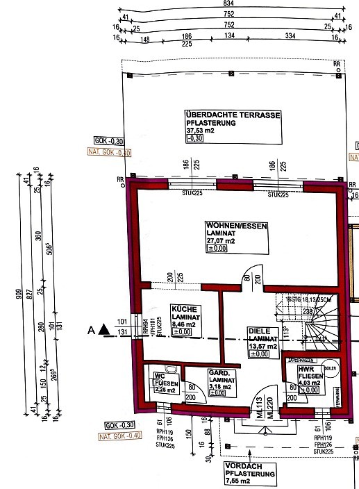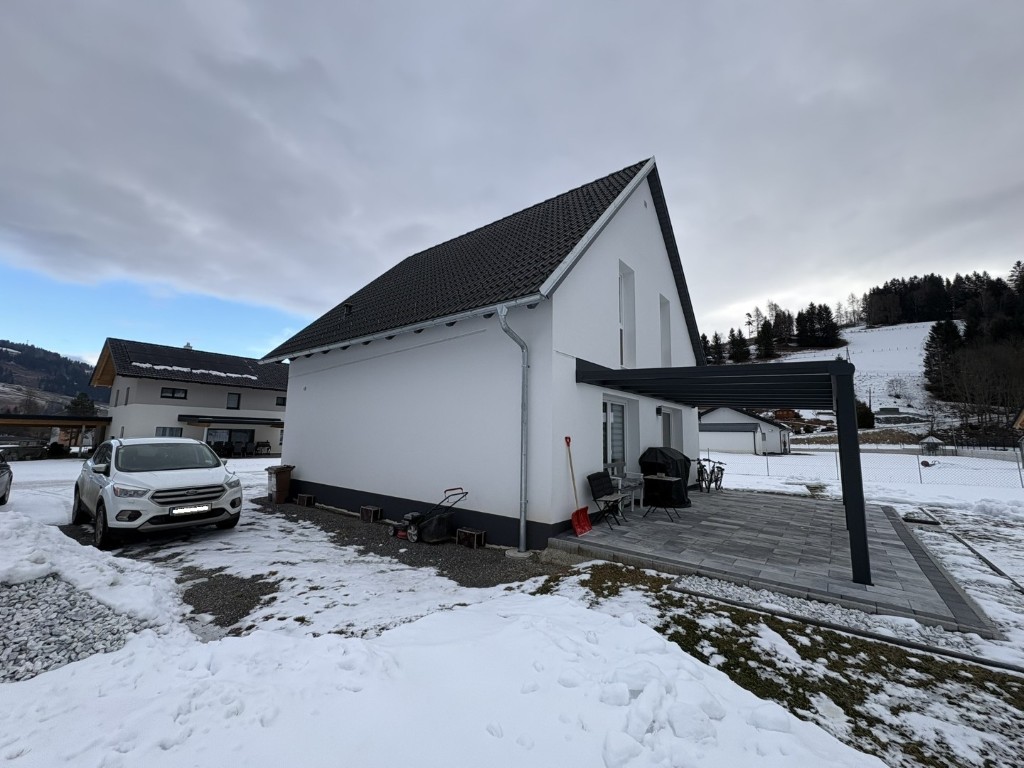 | Beschreibung: | Grundstück: Grundstück Nr. 155/37 im Ausmaß von 850 m²; das Grundstück ist nicht im Altlasten- und Verdachtsflächenkataster verzeichnet; das Grundstück ist im Grenzkataster verzeichnet (Verbindlichkeit der Grenzen und Größe); im Flächenwidmungsplan als WR (Reines Wohngebiet) mit einer Bebauungsdichte 0,2 – 0,6ausgewiesen; das Grundstück befindet sich teilweise innerhalb der Hochwasserüberflutungszone für ein 300-jähriges Ereignis; bebaut mit einem Wohnhaus und einer Gartenhütte; alle öffentlichen Anschlüsse sind vorhanden. Bebauung: Wohnhaus: Das Wohnhaus wurde beginnend im Jahr 2022 ohne Unterkellerung mit Erd- und Dachgeschoß als „Town & Country“ - Fertighaus errichtet; Baubewilligung für die Errichtung eines Einfamilienhauses mit Schutzüberdachung und Abstellraum vom 04.05.2022 vorhanden (es ist von einem konsensmäßigen Bestand auszugehen; entgegen der Baubewilligung wurde die eingangsseitige Schutzüberdachung und das westseitige Schutzdach inklusive einem Abstellraum jedoch nicht errichtet); Energiekennzahl: HWB = 59,7 kWh/m²a |