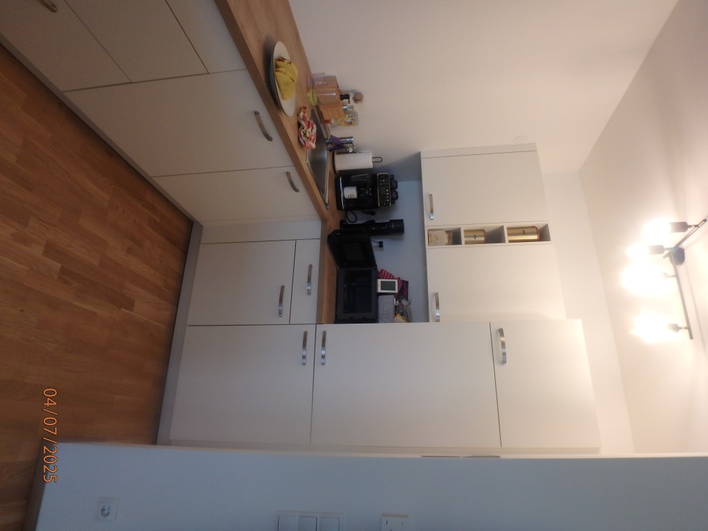 mitzuversteigerndes Zubehör: | Küchenblock: Soweit angegeben, ist die Kücheneinrichtung vermietet, steht jedoch im Eigentum des Verpflichteten. -Im Unterteil vorhanden ist ein U-förmiger Verbau, sechsteilig, mit Laden und Türen und einer Arbeitsplatte. -In die Arbeitsplatte integriert das Spülbecken sowie das Ceranfeld mit Kochplatte und Backrohr. -An diesen U-förmigen Teil angeschlossen ein Hochschrank mit Kühlschrank und Gefrierfach. -Im Bereich E-Herd ein Dunstabzug aus Niro. -Daneben liegend ein offenes Kastl mit drei Ablagen. -Am Kühlschrank angeschlossen ein zweiteiliges Kastl. |