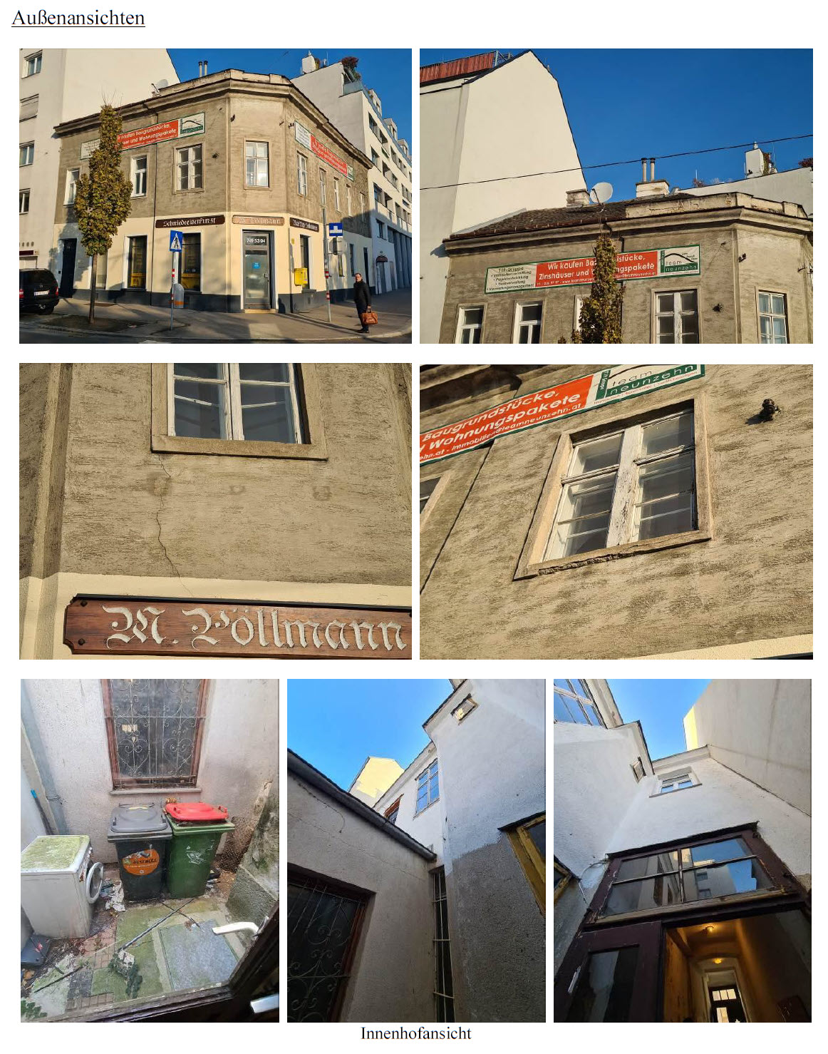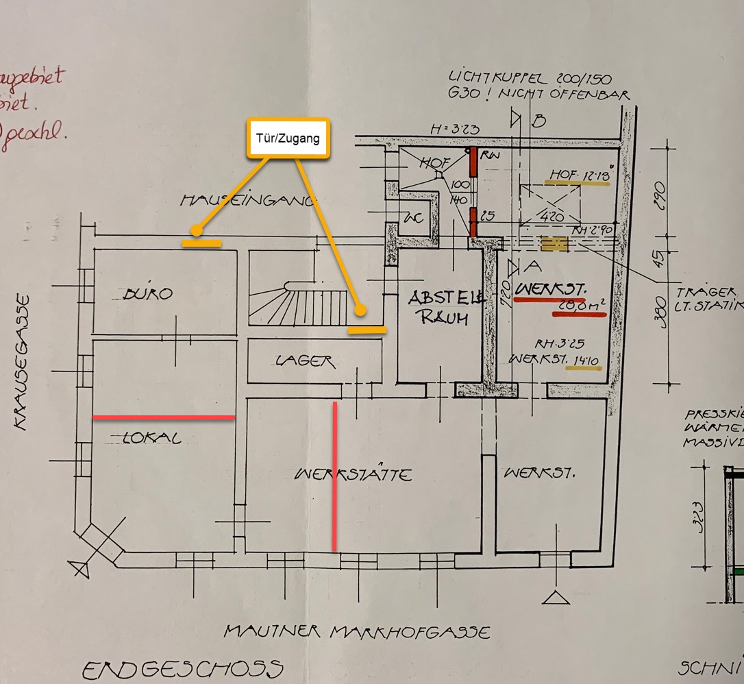| Beschreibung: | Die ggst. Liegenschaft EZ 42, bestehend aus dem GST 2311, ist als Eckliegenschaft trapezähnlich ausgestaltet und verfügt an der Krausegasse über rd. 13 m und an der Mautner-Markhof-Gasse über rd. 17 m Straßenfrontlänge. Die Grundstücksfläche beträgt lt. Grundbuch insgesamt 227 m². Auf der ggst. Liegenschaft befindet sich ein um 1886 errichtetes, teilunterkellertes Wohn- und Geschäftshaus mit 2 Geschoßen über Niveau (EG und 1.OG) sowie einem Rohdachboden. Im rückwärtigen Teil der Liegenschaft befindet sich ein kleiner Innenhof und ein nur ebenerdig verbauter Gebäudeteil (Innenhofanbau 1990). Im Erdgeschoß befindet sich eine Gewerbefläche (lt. Mietvertrag Top 1 und Top 6), deren Erschließung über das Stiegenhaus aber auch direkt von der Straße her möglich ist. Im Keller befinden sich Allgemeinflächen bzw. Kellerabteile und eine als „Kellermagazin“ bezeichnete (vermietete) Fläche, deren Zugang über das Stiegenhaus und durch den Keller erfolgt. Im Obergeschoß befinden sich 4 leerstehende Wohneinheiten, nummeriert von Top 2 bis Top 5 (Türnummerierung), bei denen tw. mit einer mittlerweile wieder eingestellten Sanierung begonnen wurde. Die Erschließung aller Etagen erfolgt über eine Stiege - ein Personenaufzug ist nicht vorhanden. Das Gebäude ist in einem mäßig bis schlechten Zustand, massive Feuchtigkeitsschäden und generelle Schäden an Fassaden, Fenstern und am Mauerwerk sind vorhanden. Großteils fehlen Sanitäranlagen in den Gewerbeflächen und Wohnungen; Gasanschluss vorhanden, jedoch großteils fehlende Radiatoren und tw. fehlende Gaszähler in den einzelnen Einheiten. Hohe Sanierungsbedürftigkeit des gesamten Gebäudes und der einzelnen Flächen. Die bestandsfreien Wohnungen (1.OG) sind unbewohnbar/stark sanierungsbedürftig, teils begonnene Sanierungsmaßnahmen wurden nicht fertiggestellt. Großteils fehlende Sanitäranlagen (Gang-WC) und Heizmöglichkeiten (teils fehlende Radiatoren/ Gaszähler). Das vermietete Geschäftslokal (EG) befindet sich in einem verwendbaren jedoch nicht mehr zeitgemäßen, abgenutzten Zu-stand. Das in Bestand befindliche Kellermagazin (Musikraum/ Tonstudio) wurde vom Benützer/Mieter adaptiert, der Zugang zum Magazin durch den Keller und der Keller an sich sind jedoch stark sanierungsbedürftig. Nach Sanierung/Aufstockung ist für die (bestandfreien) Wohnobjekte von einer ortsüblichen/ guten Ausstattung im schlüsselfertigen Erstbezugszustand auszugehen. Aktuell verfügt das Gebäude über eine vermietbare Fläche von rd. 315m² (davon rd. 39m² im KG, rd. 137m² im EG und rd. 139m² im OG. Ein Abbruch ist lt. MA 19 nicht zulässig. Mittels Aufstockung sind näherungsweise jeweils rd. 133m²im 2., 3. OG und im DG sowie rd. 56m² gew. Fläche im 2. DG möglich. Somit ergibt sich insgesamt eine gew. Fläche/Nfl. von rd. 773,50m². |