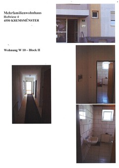 Beschreibung: | Wohnung W 10 - Block II (Wohnungseigentum) liegt im 3.OG im Mehrfamilienwohnhaus - 4550 KREMSMÜNSTER, Hofwiese 4. Die Liegenschaft liegt ca. 950 m (Fußweg) südwestlich vom Marktgemeindeamt KREMSMÜNSTER. Die gegenständliche Wohnung befindet sich in einem mittelmäßigen Bauzustand, unter Berücksichtigung des Alters. Im letzten Jahrzehnt wurden am Wohnhaus Verbesserungen durchgeführt. |