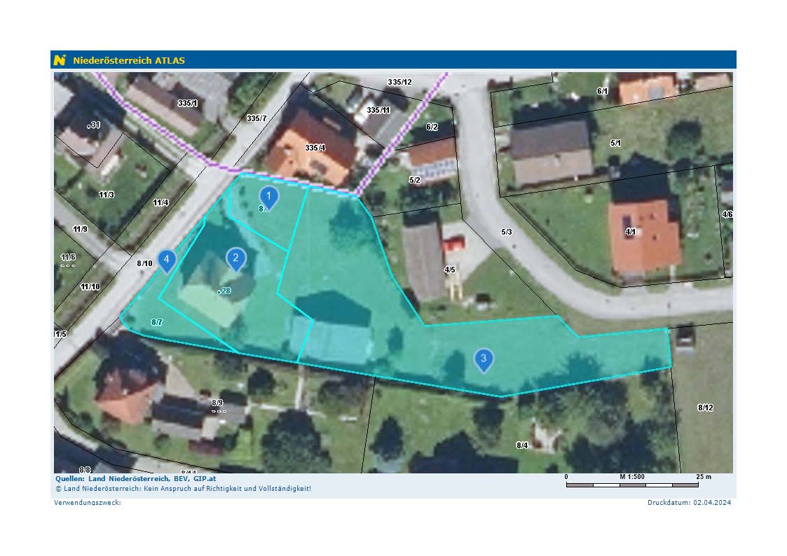 | Beschreibung: | Auf der Liegenschaft befindet sich ein in massiver Bauweise 1931 errichtetes Wohnhaus mit Keller, Erdgeschoß und Dachgeschoß sowie ein 1974 errichtetes Nebengebäude mit Garage und zwei Nebenräumen. Der Zugang in das Wohnhaus erfolgt von der Nordseite über eine Außenstiege und einen kleinen Anbau. Im Dachgeschoß befindet sich über dem Eingang eine Terrassenfläche. Eine Außentreppe führt vom Garten zusätzlich in den Keller (beim Heizraum). Die restlichen Flächen sind größtenteils einfach begrünt. Zugang respektive Zufahrt sind bis zum Haus befestigt ausgeführt. Der Zugang in das Wohnhaus erfolgt von der Nordseite über eine Außenstiege. Im Dachgeschoß befindet sich über dem Eingang eine Balkonfläche. Das Wohnhaus liegt im Südwesten der Liegenschaft, das Nebengebäude in einiger Entfernung dazu weiter östlich davon. Hauptzugang und -zufahrt erfolgen von der Pettenbach Straße aus. Jedoch kann die Liegenschaft auch von der Nordostseite aus über die Erlengasse erreicht werden. |