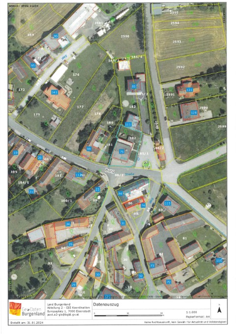 | Beschreibung: | LAGE: Das Grundstück 182 mit dem darauf befindlichen Gebäude liegt im Zentrum von Burg, vis à vis vom Feuerwehrhaus gelegen. Aufgeschlossen ist die Liegenschaft über die südseitig anschließende Straße sowie ostseitig über einen Vorplatz, sodass es sich um eine Eckparzelle handelt. Die Lage des Grundstückes ist eben, die Figuration in etwa trapezförmig. Die umliegenden Grundstücke sind großteils bebaut. INFRASTRUKTUR: Lt. Auskunft der Gemeinde besteht ein Gasthaus sowie eine Haltestelle in Burg. Einkaufsmöglichkeit für den täglichen Bedarf, Volksschule und Kindergarten befinden sich im 3 km entfernten Hannersdorf. Die nächstgelegene Bank ist in Großpetersdorf, in 8,5 km Entfernung. Sämtliche infrastrukturelle Gegebenheiten befinden sich in der ca. 20 km entfernten Bezirkshauptstadt Oberwart. GEBÄUDEBESCHREIBUNG: WOHNGEBÄUDE: Das Objekt wurde – lt. vorliegenden Baubewilligungsbescheid – 1973 errichtet und er-folgte 1980 die Benützungsbewilligung. Lt. vorliegenden Unterlagen wurden 1988 Umbauarbeiten vorgenommen bzw. das Objekt lt. Mitteilung ab 2023 renoviert, welche Renovierungen noch nicht abgeschlossen sind. Das Gebäude ist dreigeschossig in Massivbauweise, bestehend aus Keller, Erd- und Obergeschoss errichtet. An Räumlichkeiten sind im OBERGESCHOSS vorhanden: 6 Zimmer, Balkon, 2 Badezimmer, Schrankraum, WC, Waschraum sowie Vorraum und Gangflächen. Im ERDGESCHOSS befinden sich Küche, WC mit Vorraum, Zimmer mit Waschbereich, Wohn- und Esszimmer, Schlafzimmer, Badezimmer und Vorraum. An Räumlichkeiten sind im KELLERGESCHOSS vorhanden: Heizraum, Werkstätte mit Tankraum, 5 Lagerräume, Herren-WC, Damen-WC, Waschküche und Vorraum. Die Aufschließung und Erreichung erfolgen über die anschließende, asphaltierte Straße sowie den angeschlossenen Vorplatz. Der Zugang zum Wohnhaus ist von der Ostseite, über überdachte Vorlegestufen, gegeben. Südseitig erfolgt der Zugang im Bereich Wohn- und Schlafzimmer über eine einläufige, im Rohzustand befindliche Betonstiege, ohne Geländer zur Absturzsicherung. In diesem Bereich ist ein Treppenlift montiert. Die Geschosse untereinander sind durch Stiegen miteinander verbunden. AUSSENANLAGEN: Zur Ostseite besteht ein Holzlattenzaun. Die nicht bebauten und befestigten Flächen stellen Grünzonen dar. Nordseitig dem Wohnhaus angeschlossen ein Flugdach mit Bitumenwellplattendeckung. Südseitig ist beim Wohnhaus ein asphaltierter Vorplatz vorhanden. |