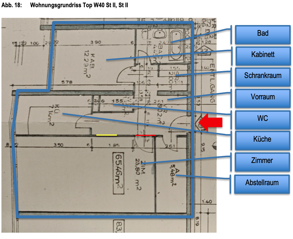 | Beschreibung: | Die bewertungsgegenständliche Wohnung Top W40 St II ist im 5. Stock der Stiege 2 der Liegenschaft situiert und wird vom allgemeinen Gang über eine einflügelige Holzsicherheitstüre mit zusätzlichem Kastenriegelschloss betreten. Die Wohnung gliedert sich in einen Vorraum, einen Abstellraum, ein Zimmer, eine Küche, ein WC, ein Kabinett, ein Bad und einen Schrankraum. Sie ist straßenseitig in Richtung Hartlgasse ausgerichtet und verfügt über in diese Richtung orientierte Fenster, die als Holzrahmenfenster ausgeführt sind. Ein Querlüften ist aufgrund der Konfiguration der Wohnung nicht möglich. Die Beheizung erfolgt mittels einer Hauszentralheizung (Fernwärme) und Radiatoren im Zimmer, Küche, Kabinett und Bad. Dem Wohnungseigentumsobjekt ist das Kellerabteil ST II/ KA 40 als Wohnungseigentumszubehör zugeordnet. Dieses befindet dich im Erdgeschoss der Stiege 2. |