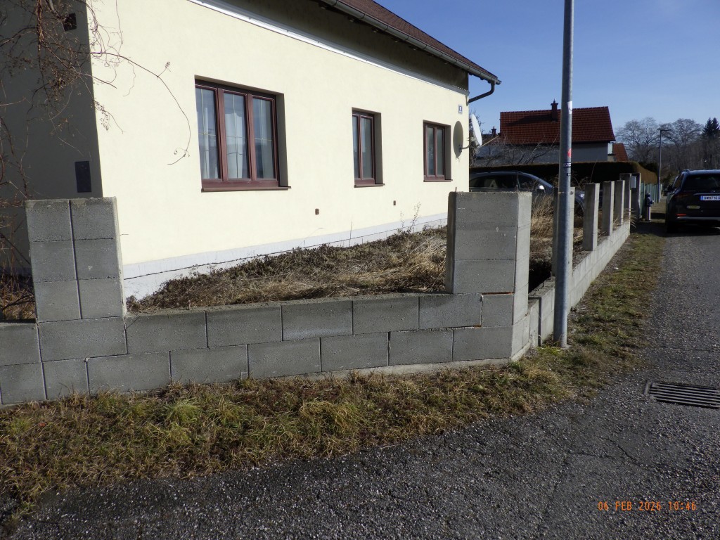 | Beschreibung: | LAGE: Dieses Grundstück mit dem darauf befindlichen Wohnhaus liegt am Stadtrand von Gloggnitz, über die Arensteingasse erreichbar, welche parallel zur ÖBB-Bahnlinie verläuft. Die Lage des Grundstücks ist eben, nachdem es sich um eine Eckparzelle handelt, ist eine trompetenförmige Ausnehmung an der Ecke Arensteingasse zur Untere Zeilfeldstraße gegeben. Aufgrund der vorbeiführenden ÖBB-Bahnlinie ist erhöhter Lärmpegel gegeben und handelt es sich um keine ideale Wohnlage. Die umliegenden Grundstücke sind, soweit bekannt, recherchiert und ersichtlich mit Wohn- und Nebengebäuden bebaut. INFRASTRUKTUR: Sämtliche infrastrukturellen Gegebenheiten, wie öffentliche Haltestellen (Bahn und Bus), Gaststätten, Einkaufsmöglichkeiten für den täglichen Gebrauch, Kinderbetreuungseinrichtung, Schulen, Banken, etc. sind in Gloggnitz vorhanden. GEBÄUDEBESCHREIBUNG: Soweit dem beigeschafften Bauakt zu entnehmen, wurde dieses Wohnhaus 1905 errichtet. Pläne aus dieser Zeit liegen mir nicht vor. Vorliegend sind mir Grundrisse des Bestands (nicht zur Gänze der Natur entsprechend) aus dem Jahr 2018. Soweit durch Augenschein feststellbar, wurde das Gebäude restauriert und Instand gesetzt und hat rechteckige Grundrissform. Vorhanden ist ein Erdgeschoß, ein teilweise ausgebauter Dachboden sowie ein kleiner Kellerbereich. Im Erdgeschoß sind folgende Räumlichkeiten vorhanden: Wohn- und Esszimmer, Küche, Vorraum, WC, Zwischenflur, Wirtschaftsraums, Badezimmer / WC sowie Eingang mit Stiege zum Dachgeschoß. Im teilweise ausgebauten Dachboden befinden sich Zimmer 1, Flur, Vorraum bei der Stiege sowie Zimmer 2. Im Keller befindet sich ein Kellerraum. Im rückwärtigen Bereich des Gebäudes befinden sich zwei schliefbare Keller. Die Aufschließung und Erreichung ist zweiseitig gegeben über die Arensteingasse und die die Untere Zeilfeldstraße. Eingänge am Haus bestehen sowohl von der Rück- / Gartenseite, als auch von der Straßenseite aus. Die schliefbaren Keller sind ausschließlich über Türluken vom Garten aus erreichbar. Die Geschoße untereinander, Keller- bis Dachgeschoß, sind über eine Stiege im Haus verbunden. AUSSENANLAGEN, EINFRIEDUNGEN UND VORDÄCHER: Straßenseitig besteht eine Einfriedung aus Sockel- und Pfeilermauerwerk in Schalsteinen, zur Gänze unverputzt ohne Tür und ohne Tore sowie ohne Zaun. Ersichtlich ist straßenseitig der Gaszähler sowie der Stromverteiler und der Hydrant im Nahbereich der Grundgrenze. Zugang und Zufahrt zum Haus von der Arensteingasse sind mit Verbundsteinplatten belegt und mit Gras durchwachsen, an der rechten Seite besteht eine Einfriedung aus einem Betonsockel mit einem Maschenzaun. Gleichfalls eine Einfriedung aus Sockel- und Pfeilermauerwerk in Schalsteinen besteht zur Untere Zeilfeldstraße und ist auch hier kein Tor und keine Tür vorhanden. Auch an der rückwärtigen Grundgrenze in diesem Bereich ist ein Maschenzaun hergestellt. Zugänge zum Haus bestehen von der Straßen- und von der Gartenseite aus. Soweit ersichtlich, besteht der Haupteingang von der Arensteingasse (rechte Seite). In diesem Bereich ist eine Holzkonstruktion mit einer Holzstiege vorhanden. Dieser Bereich ist überdacht und mit Trapezblech gedeckt. An der Rückseite besteht ein kleiner Vorbau mit einem Pultdach und Blecheindeckung. Es sind zwei Zugänge vorhanden, wobei ein Zugang zu einer Kunststeinstiege besteht. Dieser ist überdacht, auf eine Sichtmauerwerkssäule gestützt und als Windschutz eine Metallkonstruktion mit Drahtverglasung vorhanden. Beim zweiten Zugang handelt es sich um eine Vorlegstufe, welche verfliest und nicht überdacht ist. Die nicht bebauten und befestigten Flächen stellen Grünzonen dar, welche verwildert sind. |