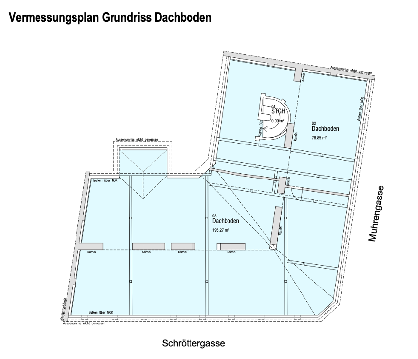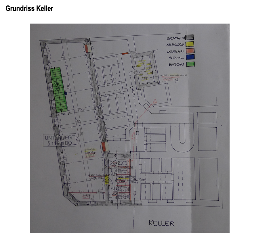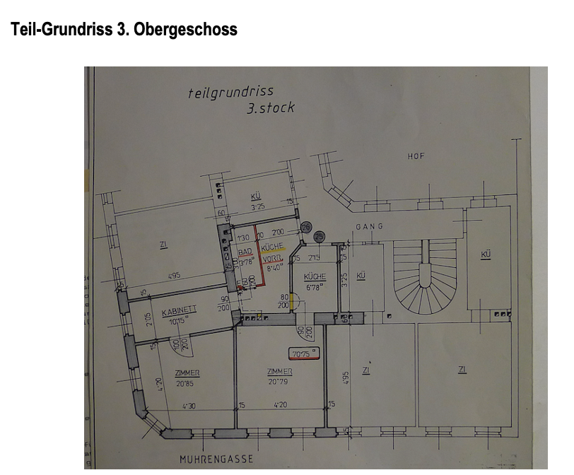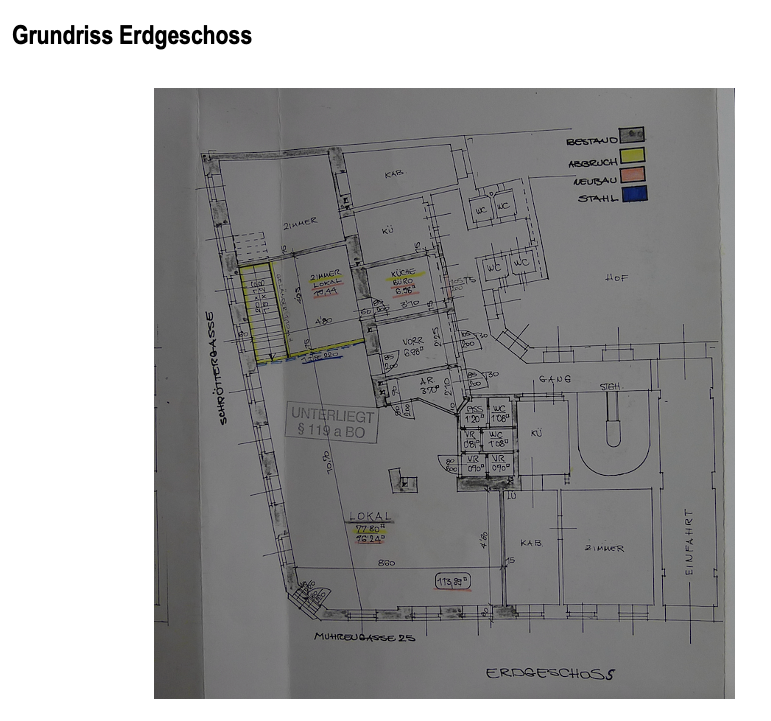 | Beschreibung: | Beim bewertungsgegenständlichen Gebäude handelt es sich um ein unterkellertes, viergeschossiges Mietwohnhaus mit nicht ausgebautem Dachgeschoss. Im Bauakt der Liegenschaft waren weder historische Planunterlagen, noch vollständige Grundrisspläne, noch Informationen über den ursprünglichen Errichtungszeitpunkt vorhanden. Im Häuser-Kataster der Bundeshauptstadt Wien, III.Band, 1929, von J. Wolfgang Salzberg ist als Errichtungsjahr das Jahr 1897 angegeben. Die Liegenschaft befand sich am Tag der Befundaufnahme in einem unterdurchschnittlichen, sanierungsbedürftigen, teilweise baufälligen Erhaltungszustand. Die Bodenbeläge in den allgemeinen Gangbereichen wurden in Teilbereichen abgetragen, an den Wand- und Deckenoberflächen sind teilweise Wasser- und Putzschäden ersichtlich und diese wurden zum Teil abgeschlagen. In einzelnen Stockwerken sind in den allgemeinen Gangbereichen freihängende Kabel/Leitungen ersichtlich. Der Fassadenverputz weist straßenseitig und hofseitig einen sanierungsbedürftigen Zustand auf und wurde teilweise abgeschlagen. Diesbezüglich wird auf die offenen Bauaufträge verwiesen. Das Gebäude wird augenscheinlich nicht laufend instand gehalten. Der Zugang zum Gebäude erfolgt von der Muhrengasse über ein doppelflügeliges Holztor bzw. verfügt das Geschäftslokal im Erdgeschoss über einen separaten straßenseitigen Zugang von der Ecke Schröttergasse/Muhrengasse. |