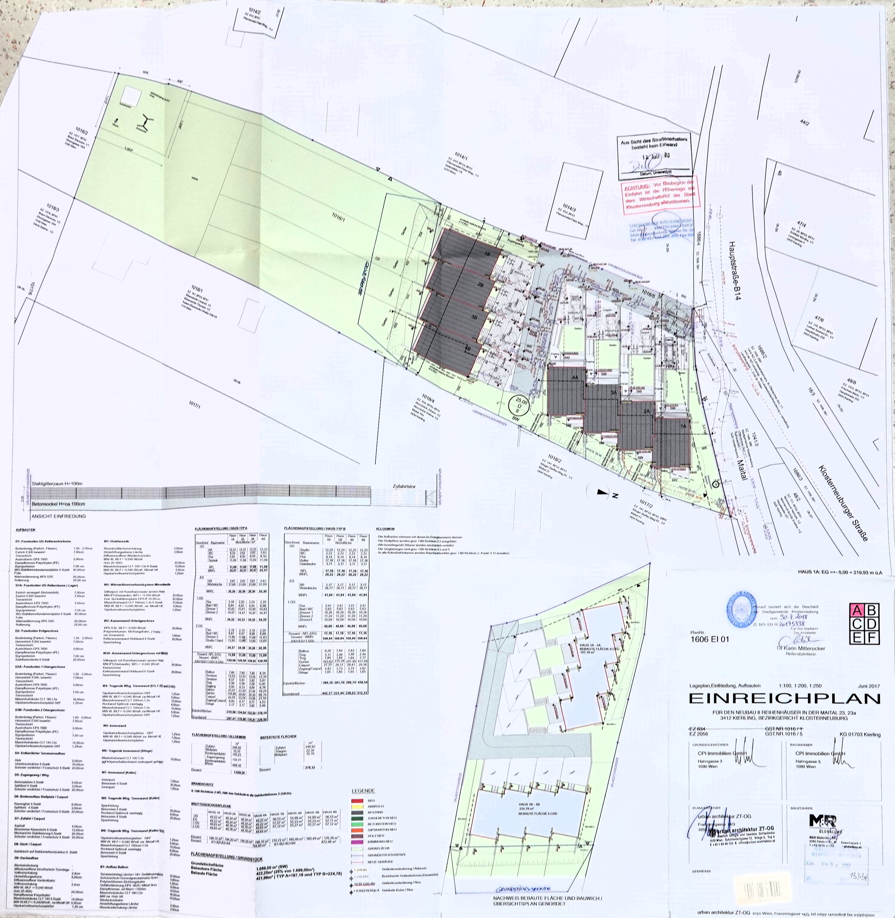 Beschreibung: | GST-NR 1016/1 Gärten (10) 1507m² 1016/5 1960m² Kierling Bauf. 469 m2 Gärten 1491 m2 GESAMTFLÄCHE 3.467m² mit Reihenhausanlage bestehend aus 8 Reihenhäusern bestehend aus Wohnhäusern Typ A (Untergeschoß: Technikraum, Flur, Abstellraum, WC; Erdgeschoß: Vorraum, Wohnküche; 1. Obergeschoß: 2 Zimmer, Bad/WC, Flur, Balkon; 2. Obergeschoß: Flur, Zimmer, Studio, Bad WC) und Wohnhäusern Typ B (Untergeschoß: Zimmer, Flur, WC, Keller; Erdgeschoß: Abstellraum, Wohnküche, 1. Obergeschoß: 3 Zimmer, BadWC, Flur, Balkon) mit folgenden, den Einreichplänen entnommenen Flächen: Haus 1A: UG 35,27m², EG 34,42 m², 1.OG 34,52m², 2.OG:34,44m2 ; Haus 2A UG 35,34m², EG 34,54 m², 1.OG 34,16m², 2.0G: 34,08m2 ; Haus 3A UG 35,55m², EG 34,54 m², 1.OG 34,16m², 2.0G:34,07 m2 ; Haus 4A UG 35,42m², EG 34,43 m², 1.OG 33,82m², 2.0G:34,17m2 ; Haus 1B UG 39,19m², EG 40,85 m², 1.OG 41,04m², Haus 2B UG 39,19m², EG 41,15 m², 1.OG 40,57m², Haus 3B UG 39,19m², EG 41,15 m², 1.OG 40,59m², Haus 4B UG 39,19m², EG 40,85 m², 1.OG 41,03m², jeweils mit Außenanlagen (Carports wurden nicht ausgeführt) in Maital 23, 3400 Kierling unter Berücksichtigung der erforderlichen Neueinreichung Baubewilligung |