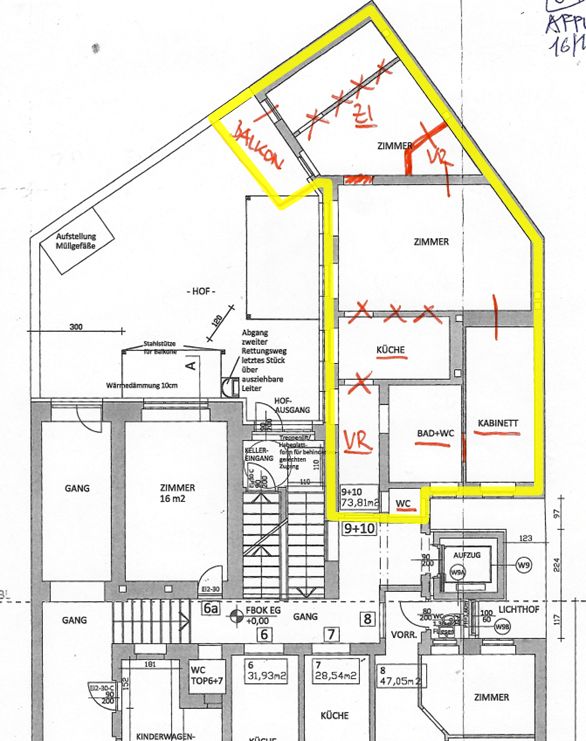 | Beschreibung: | Das Wohnhaus im 14. Wiener Gemeindebezirk wurde zu Beginn des 20.Jahrhunders errichtet, seit Errichtung des Wohnhauses erfolgten diverse Umbauten und Wohnungszusammenlegungen, der Dachgeschossausbau erfolgte in den Jahren 2016 bis 2024. Das Wohnhaus besteht aus einem Kellergeschoss, einem Erdgeschoss, drei Obergeschossen und zwei Dachgeschossen. Die zu bewertende Wohnung Top 9-10 befindet sich im Erdgeschoss. Im Kellergeschoss sind die Kellerabteile der Wohnungen, zwei Werkstätten und ein Magazin untergebracht. Im Erdgeschoss, den Obergeschossen und den Dachgeschossen sind Wohnungen vorhanden. Das Gebäude ist in Massivbauweise errichtet und hat straßenseitig eine gegliederte Fassade. Das Dach ist als Mansarddach ausgebildet. Das Gebäude ist mit einem Aufzug ausgestattet. Die Liegenschaft ist parifiziert, an den Wohnungen, den Werkstätten und dem Magazin ist Wohnungseigentum begründet und im Grundbuch der EZ 1314 eingetragen. Die Kellerabteile sind den Wohnungen nicht als Zubehör gemäß WEG zugeordnet. Das Wohnhaus ist in einem dem Alter entsprechend durchschnittlichen Zustand vorhanden. Bauwerksstatische und vermessungstechnische Überprüfungen sowie bautechnische und haustechnische Bauwerksüberprüfungen haben durch den Sachverständigen im Zuge der Befundaufnahme auftragsgemäß nicht stattgefunden (kein bautechnisches Gutachten), die Beschreibung der vorhandenen Bauausführungen erfolgte ausschließlich durch augenscheinliche Befundung des Gebäudebestandes (ohne Bauwerksöffnungen). Die Wohnung Top 9-10 liegt im Erdgeschoss und besteht aus einem Vorraum, einem Bad, einem WC, einer offenen Küche, einem internen Vorraum, zwei Zimmer und einem Kabinett. Die Wohnung ist hofseitig (südseitig) ausgerichtet. Einem der Zimmer ist ein Balkon vorgelagert (Gemäß Nutzwertgutachten kein Teil der Wohnung sowie im Ausführungsplan aus 2023 nicht vorhanden!). Die Raumhöhe beträgt in den Wohnräumen rund 2,80m. Die Wohnung wird mittels einer Gastherme im Bad beheizt und mit Warmwasser versorgt, die raumseitige Wärmeabgabe erfolgt durch Plattenheizkörper. Die Wohnung wird durch Kunststofffenster belichtet. Im Vorraum befindet sich der Wohnungsapparat der Gegensprechanlage sowie der Elektrosicherungskasten. Die Wohnung ist bis auf eine Kücheneinrichtung (Einbauküche mit Elektrogeräten) unmöbliert. Die Wohnung befindet sich in einem durchschnittlichen bis guten Zustand, der in der Natur vorhandene Balkon ist baubehördlich und wohnungseigentumsrechtlich nicht bewilligt und weist baulich keine ausreichende Absturzsicherung (Ausbildung des vorhandenen Geländers, Geländerhöhe, Brüstungsmauer zur Nachbarliegenschaft) auf. |