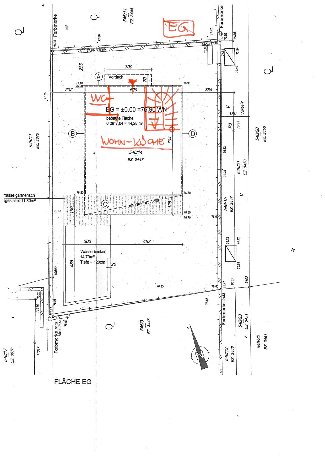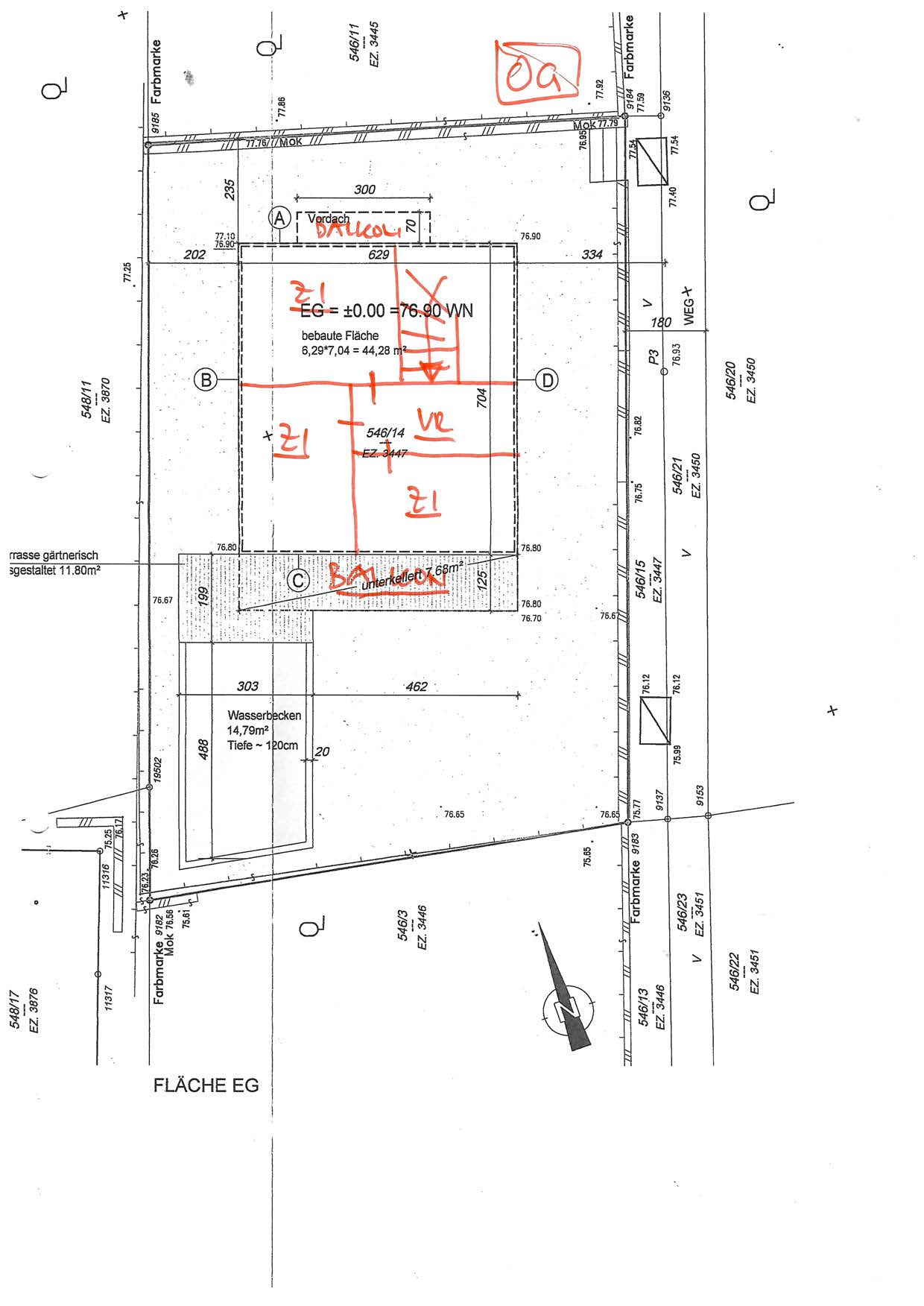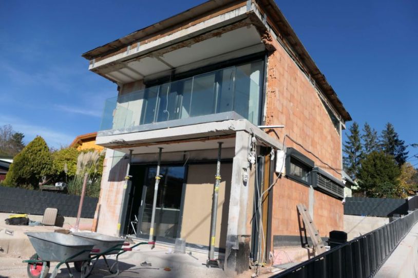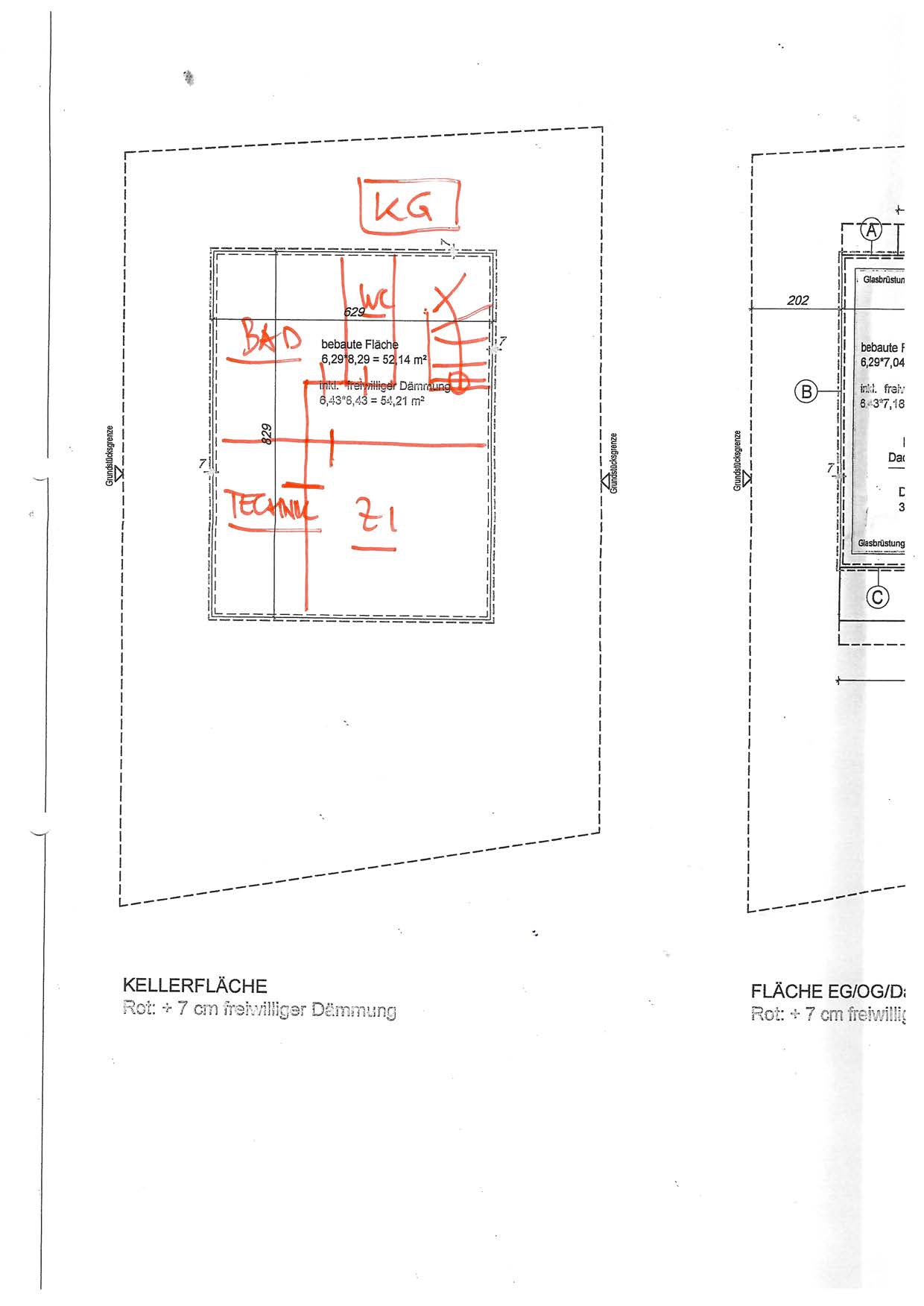 | Beschreibung: | Das Kleingartenwohnhaus wurde um das Jahr 2020 erbaut, es besteht in unfertigem Zustand (außen Rohbauzustand) aus einem Kellergeschoss, einem Erdgeschoss und einem Obergeschoss. Das Gebäude ist in Massivbauweise errichtet, das Dach ist als Flachdach ausgebildet. Das Gebäude wird durch Alufenster (großteils Schiebetürelemente) belichtet. Die Böden sind mit Fliesen ausgestattet, die Wände und Decken sind geputzt und gemalt, die Wandanschlüsse und die Installationsschächte sind teilweise offen. Die Beheizung erfolgt durch eine Gastherme im Kellergeschoss, die raumseitige Wärmeabgabe erfolgt durch eine Fußbodenheizung. Im Technikraum im Kellergeschoss befindet sich die Gastherme, ein Warmwasserspeicher, der Elektrosicherungskasten auf Putz montiert, ein Waschmaschinenanschluss und der Wasseranschluss, der Kanalschacht ist offen. Der Außenbereich befindet sich in unfertigem Zustand, ein gemauertes Schwimmbecken ist in unfertigem Zustand (Rohbauzustand) vorhanden. Die Einfriedungsmauern bestehen aus Betonschalsteinen. Das Gebäude befindet sich in unfertigem Zustand. Es liegt ein Abbruchbescheid für das Gebäude und die Einfriedungsmauern vor, da die Baulichkeiten vorschriftswidrig errichtet wurden ("bebaute Fläche und Gebäudehöhe des Kleingartenhauses sind größer als zulässig" - siehe Bescheide und Mitteilungen der MA 37 - Beilage 4). Der Eigentümer hat begonnen, die Grundrissfläche des Gebäudes zu verkleinern, indem er auf der Südseite die Außenwand zurückversetzt hat. Diese Umbauarbeiten sind in unfertigem Zustand vorhanden, teilweise offene Wandanschlüsse vorhanden. Eine objektive Überprüfung dieser Rückbaumaßnahmen durch einen befugten Bauführer ist bisher nicht erfolgt, sodass gemäß Auskunft der MA 25 - Technische Ersatzmaßnahmen ein Abbruch des Gebäudes derzeit bescheidmäßig rechtsgültig vorgeschrieben ist und somit im Raum steht. Bauwerksstatische und vermessungstechnische Überprüfungen sowie bautechnische und haustechnische Bauwerksüberprüfungen haben durch den Sachverständigen im Zuge der Befundaufnahme auftragsgemäß nicht stattgefunden (kein bautechnisches Gutachten), die Beschreibung der vorhandenen Bauausführungen erfolgte ausschließlich durch augenscheinliche Befundung des Gebäudebestandes (ohne Bauwerksöffnungen). |