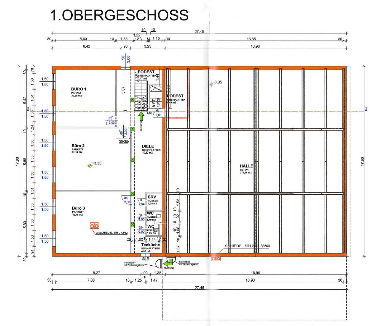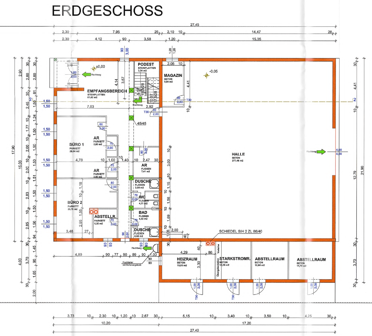 | Beschreibung: | Das insgesamt rund 10.000m² Grundstück weist zwei Staßenfronten am Trattnerring 6 und 14 auf und befindet sich im Bauland-Betriebsgebiet. Die Hauptzufahrt zur Liegenschaft erfolgt vom Trattnering 6. Es besteht ein rnd. 477m² großes Bürogebäude welches über EG und zwei Obergeschosse verfügt. Die tatsächliche Nutzung des Gebäudes erfolgt einerseits als Büro und Werkstätten und ist in größeren Teilbereichen im EG als auch durchgehend im 2.OG eine tatsächliche Wohnungsnutzung gegeben. Gekuppelt an das Bürogebäude ist eine Werks- u. Lagerhalle errichtet, die aus dem südseitig vorgelagerten befestigten Platz über ein großes Lagertor erschlossen ist. Daneben bestehen sowohl im EG als auch aus dem 1.OG des Bürohauses über Brandschutztüren Zugänge in den Bereich der Halle, als auch in dem im 1.OG gelegenen Teil einer nachträglich ohne Baubewilligung errichteten Werkstättenebene, welche über die im EG gelegenen Werkstätten- und Lagerräume eingezogen wurde. Abgesehen von den im Einreichplan des Feststellungsbescheides genehmigten Podest im 1. OG und einem Magazin im EG der Lagerhalle sind die andern bestehenden Räume im Bereich der Lagerhalle ohne behördliche Bewilligung errichte worden. Im Südlichen Teil des Grundstückes besteht eine größere Teichanlage mit einem Steg und einer Krananlage für die aber angeblich keine wie immer geartete wasserrechtliche noch sonstige Bewilligung besteht. Entlang der Grundstücksgrenze im Süden ist ein großes Zelt errichtet welches aber nach Angaben der verpflichteten Partei einem Mieter gehört. Entlang der weiteren Grenzen an der Süd als auch der Westseite sind diverse Container aufgestellt und größere Lagerungen vorgenommen worden. An der Westseitigen Grundstücksgrenze ist darüber hinaus eine Lagerhalle mit Blechdach hergestellt für welche keine behördliche Bewilligung besteht und welche daher auch nicht mitbewertet wurde. Die sonstigen Außenanlagen sind durch teilweise befestigte Wege gegeben und bestehen teilweise Außenbeleuchtungen, Strom- und Wasseranschlüsse sowie eine alte Brunnenanlage. Die sonstigen Freiflächen sind Großteils als Wiesenflächen mit Baum und Strauchbestand angelegt. Im mittleren Teil des Grundstückes ist eine großzügige Spielanlage mit Klettergerüsten etc. hergestellt. |