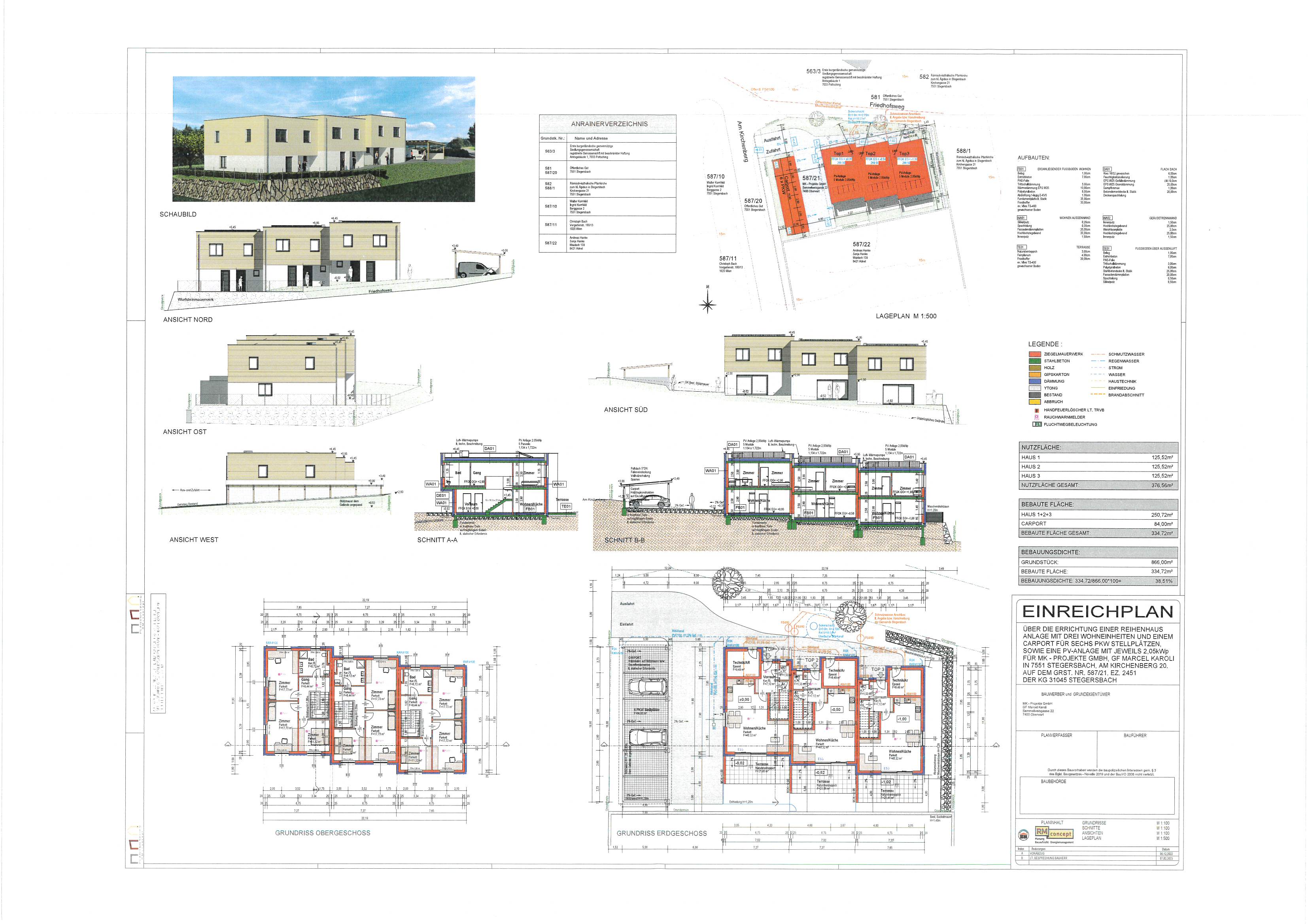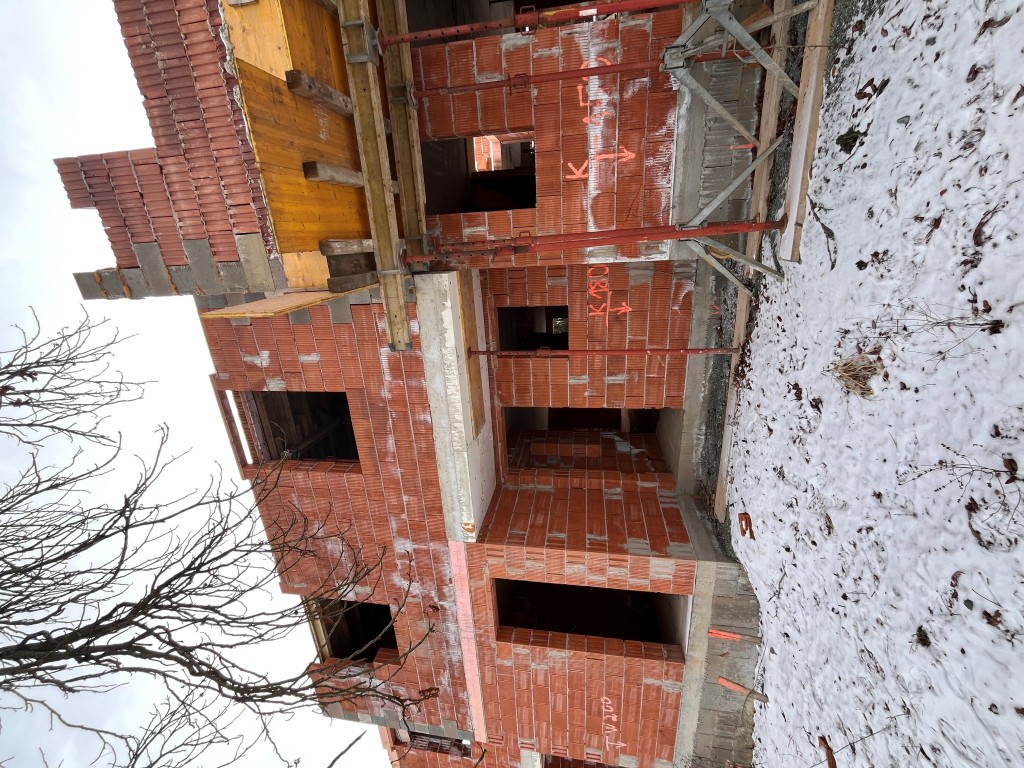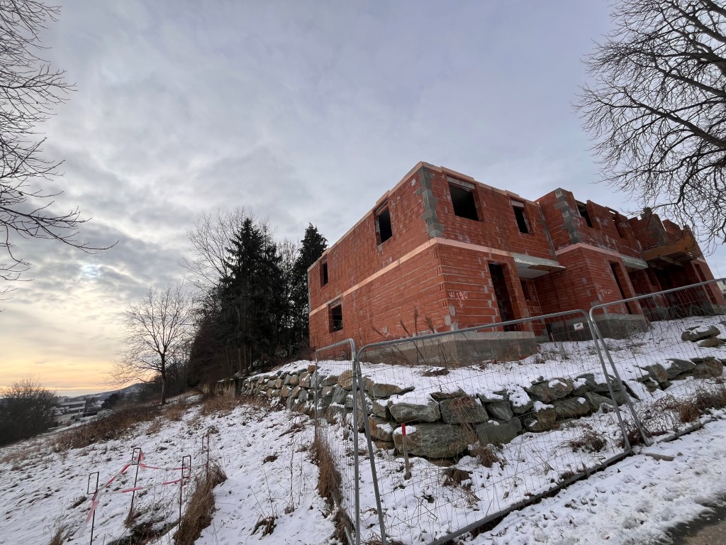 | Beschreibung: | LAGE: Das Grundstück mit den darauf im Rohbau befindlichen Gebäuden liegt im westlichen Ortsteil von Stegersbach auf einer Anhöhe in der Nähe des Friedhofs und der Kirche. Das Grundstück ist nach Osten hin geneigt, die Figuration ungleichmäßig. Die Aufschließung und Erreichung erfolgt von der Westseite über die Straße Am Kirchenberg. Nordseitig angrenzend ist ein Gehweg, welcher in Richtung Ortszentrum und den Kirchen führt. INFRASTRUKTUR: Sämtliche infrastrukturellen Gegebenheiten, wie öffentliche Haltestellen (Bus), Gaststätten, Einkaufsmöglichkeiten für den täglichen Gebrauch, Kinderbetreuungseinrichtung, Schulen, Einrichtungen zur medizinischen Versorgung, Ausbildungs- und Betreuungseinrichtungen, Banken, etc. befinden sich in näherer Umgebung und sich auch zu Fuß erreichbar. GEBÄUDEBESCHREIBUNG: Der Baubeginn der im Rohbauzustand befindlichen drei Gebäude, welche mit Erd- und Obergeschoß zweigeschoßig ausgeführt sind, erfolgte mit Bescheid ab April 2023. Zum Zeitpunkt der Befundaufnahme waren Erd- und Obergeschoß in Ziegelmassivbauweise hergestellt und im Rohzustand. Anzumerken ist, dass beim Reihenhaus Top Nr. 1 das Obergeschoß ohne Decke ausgeführt ist, bei Reihenhaus Top Nr. 2 ebenfalls keine Decke besteht, jedoch bereits die Schalung vorhanden ist und bei Reihenhaus Top Nr. 3 bereits eine Betondecke besteht. Eine Dachausführung besteht ebenfalls nicht. Als Fundierung bestehen Betonstreifenfundamente mit Sockelmauerwerk, als Zwischendecke über dem Erdgeschoß eine Massivdecke. An Räumlichkeiten waren in allen drei Objekten geplant Vorraum, WC, Wohnen / Küche sowie Technik und Abstellraum und Terrasse im Erdgeschoß sowie Gang, drei Zimmer und Bad mit WC im Obergeschoß. Die Raumteilungen bestehen zum Teil nur im Erdgeschoß. Als Geschoßverbindungen sind Betonstiegen vorhanden. Der Bau- und Erhaltungszustand ist aufgrund von Niederschlagswassereintritten, da kein Dach besteht, als schlecht zu bezeichnen. AUSSENANLAGEN: Die Hauptzufahrt zum Grundstück erfolgt von der Straße mit der Bezeichnung Am Kirchenberg. Zu dieser Straße hin besteht ein einfacher Bauzaun als Abgrenzung. Im Anschluss an die geplante Zufahrt waren sechs Carports geplant mit einer Betonsteinwand. Die Betonsteinwand besteht, wie planlich dargestellt, nicht und wurde hier eine Steinschlichtung zur Straße hin hergestellt. Am Ende der Reihenhausanlage zur Ostseite hin beim Reihenhaus Top Nr. 3 besteht ebenfalls eine Steinschlichtung als Grundstücksabschluss. Die restlichen Grundstücksflächen sind aufgrund der Bauphase ungepflegt, nicht fertiggestellt und befindet sich auch Bauschutt auf der Liegenschaft. |