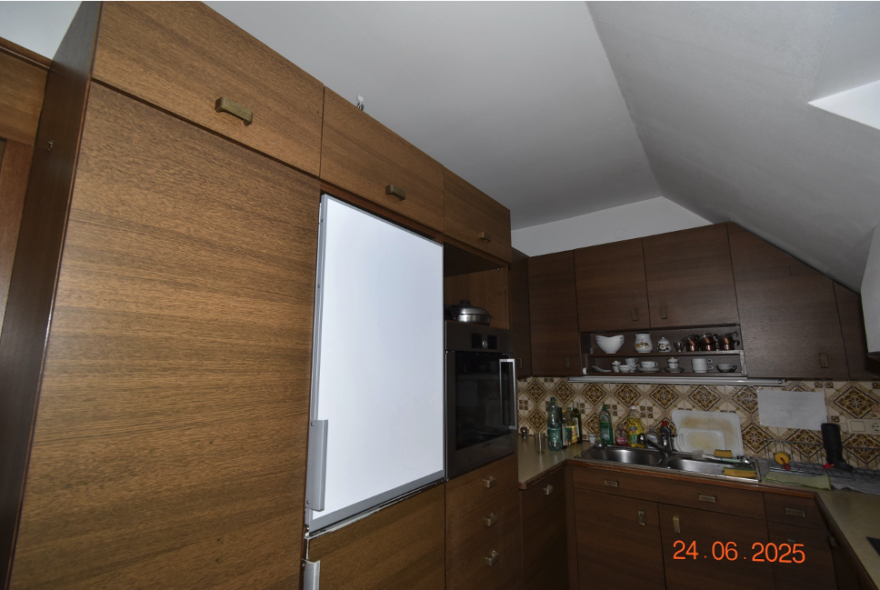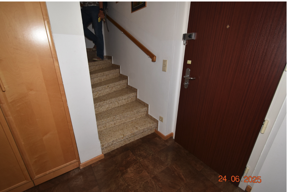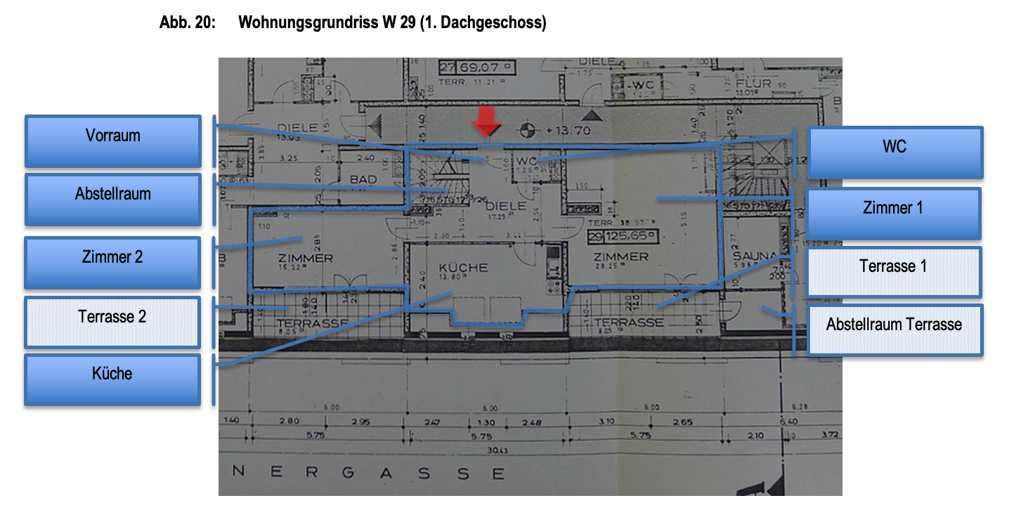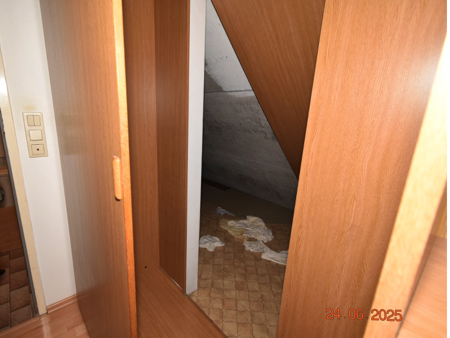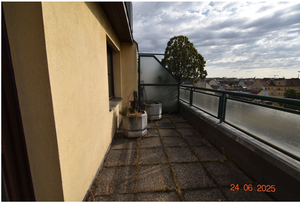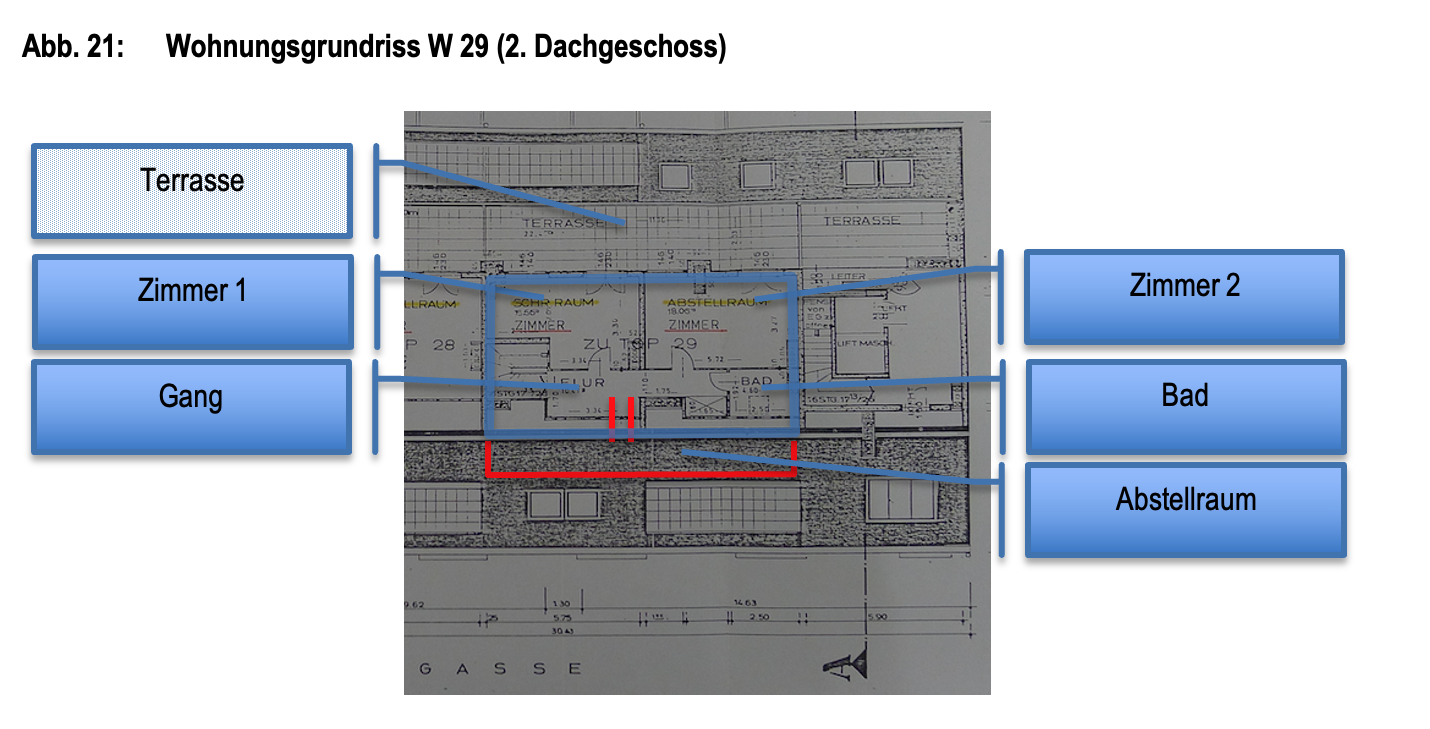Beschreibung: | Das Objekt ist im 1. und 2. Dachgeschoss situiert und wird vom allgemeinen Gang des 1. Dachgeschosses über eine einflügelige Holztür betreten. Die Wohnung besteht auf der ersten Ebene aus einem Vorraum, zwei Zimmern, zwei Terrassen, einer Küche, einem WC und einem Abstellraum unter dem internen Treppenaufgang sowie einem weiteren Abstellraum, der über die Terrasse 1 zugänglich ist. Ein interner Stiegenaufgang vom Vorraum führt zur 2. Ebene, wo ein Gang, zwei Zimmer, eine Terrasse sowie ein Bad mit WC vorhanden sind. Weiters wurde vom Gang ein Durchbruch in den Dachbodenraum vorgenommen und ein Abstellraum geschaffen. Eine baubehördliche Genehmigung liegt hierfür nicht vor. Über eine Zustimmung der übrigen Wohnungseigentümer liegen ebenfalls keine Informationen vor. Die Wohnung ist sowohl straßen- als auch hofseitig ausgerichtet. Die Fenster der Wohnung sind ebenfalls straßen- und hofseitig ausgerichtet und teilweise als Dachflächenfenster ausgeführt. Ein Querlüften ist aufgrund der Konfiguration nicht möglich. Die Beheizung erfolgt mittels einer Hauszentralheizung und Radiatoren in den einzelnen Räumen. Der Erhaltungszustand ist als durchschnittlich bis sanierungsbedürftig zu bezeichnen. Die verpflichtete Partei wies im Rahmen der Befundaufnahme auf die undichten Terrassenwannen hin. Weiters wurde bekannt gegeben, dass es teilweise Probleme mit den Radiatoren der 2. Dachgeschossebene und Feuchtigkeitseintritte bei Schneefall gäbe und dass die Gaszentralheizung vor ca. 15 Jahren erneuert wurde. Der Sohn und Erwachsenenvertreter der betreibenden Partei übermittelte nach der Befundaufnahme folgende Information: "Ergänzend zur heutigen Besichtigung möchte ich betonen, dass mir keine Schäden an den Terrassenwannen bekannt sind - wie der zweite Wohnungshälfte-Eigentümer Andreas Marchart mitgeteilt hat. Die Hausverwaltung kümmert sich bestens um den Erhalt des Hauses und dringende Schäden werden zeitnah behoben. Ich habe mich diesbzgl. auch nochmal beim zuständigen Betreuer der Hausverwaltung Ludwig Hallas (Herr Schlader, 01 521 38 – DW 47, https://www.hallas.at/) erkundigt, welcher von aktuellen Wasserschäden ausgehend von den Terrassen nichts wusste. Die Fenster der Wohnung wurden vor kurzem außen frisch gestrichen, weiters wird im Sommer ein Termin zur Fensterjustierung und Jalousienwartung geplant." Über die elektrische Anlage kann keine Aussage getroffen werden. Es erfolgte außerdem keine Überprüfung der Einhaltung diverser baurechtlicher Vorschriften (zB. WrBO, OIB-Richtlinien, ÖNormen, DINormen, Elektrotechnikverordnung) sowie der Bauphysik, Statik usw. Es kann weiters keine Aussage über die Qualität der Feuchtraumisolierungen getätigt werden. Ein gemauertes Kellerabteil ist vorhanden. |