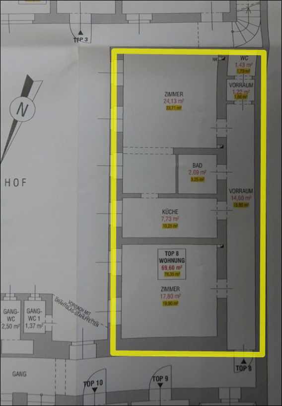 Beschreibung: | Das Wohn- und Geschäftshaus wurde vor dem Jahr 1900 errichtet und besteht aus einem straßenseitigen Gebäudeteil, einem Seitentrakt sowie einem Hofgebäude. Das Gebäude besteht aus einem Erdgeschoss, drei Obergeschossen und einem Dachgeschoss, das Gebäude ist teilweise unterkellert. Das Hofgebäude besteht aus einem Erdgeschoss, einem Obergeschoss und einem Dachgeschoss und ist nicht unterkellert. Das bewertungsgegenständliche Wohnungseigentumsobjekt Top 8 (Wohnungseigentum an Abstellraum) befindet sich im Erdgeschoss des Seitentraktes. Im Erdgeschoss des Hauptgebäudes befinden sich Abstellräume und Geschäftslokale, im Erdgeschoss des Hofgebäudes befindet sich eine Wohnung und eine Waschküche, in den Obergeschossen und den Dachgeschossen sind Wohnungen angeordnet. Im Kellergeschoss befinden sich Kellerabteile, die Kellerabteile sind den Wohnungen nicht als Zubehör gemäß WEG zugeordnet. Das Gebäude ist in Massivbauweise errichtet und hat eine einfach gegliederte Fassade. Das Dach ist als Satteldach bzw. Flachdach ausgebildet. Das Gebäude ist mit einem Aufzug (mit Schlüsselschalter) ausgestattet. Der Innenhof ist befestigt, im Innenhof befinden sich die Müllcontainer. Die Liegenschaft ist parifiziert, an den Geschäften, Wohnungen und Abstellräumen ist Wohnungseigentum begründet und im Grundbuch der EZ 20 einverleibt. Der von der SplusO Immo GmbH durchgeführte Dachgeschoss-Ausbau ist mangelhaft, eine durchgreifende Sanierung ist gemäß Auskunft der Hausverwaltung dringend notwendig. Bauwerksstatische und vermessungstechnische Überprüfungen sowie bautechnische und haustechnische Bauwerksüberprüfungen haben durch den Sachverständigen im Zuge der Befundaufnahme auftragsgemäß nicht stattgefunden (kein bautechnisches Gutachten), die Beschreibung der vorhandenen Bauausführungen erfolgte ausschließlich durch augenscheinliche Befundung des Gebäudebestandes (ohne Bauwerksöffnungen). Das Wohnungseigentumsobjekt Top 8 befindet sich im Erdgeschoss des Seitentraktes und besteht aus einem Vorraum, einem WC mit Vorraum, einem Bad, einer Küche und zwei Zimmer. Das Objekt ist westseitig ausgerichtet. Die Raumhöhe beträgt rund 3,20m Die Beheizung und Warmwasserversorgung erfolgt durch eine Gastherme im Bad. Das Objekt ist möbliert, die Möblierung und das sonstige Inventar sind nicht Gegenstand der Bewertung. Das Wohnungseigentumsobjekt befindet sich in einem abgewohnten, teilweise verschmutzten Zustand und ist als Wohnung vermietet bzw. wird derzeit als Wohnung genutzt. Gemäß Nutzwertgutachten vom 18.02.2022 ist das Wohnungseigentumsobjekt Top 8 als Abstellraum gewidmet, das im Nutzwertgutachten als Zubehör angeführte begehbare Flachdach ist nicht vorhanden (wurde gemäß Auskunft der Hausverwaltung (noch) nicht errichtet). |