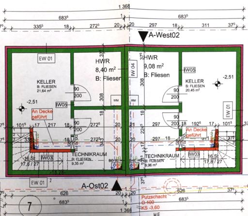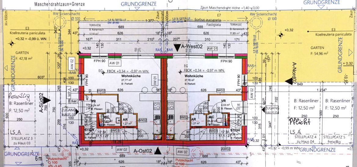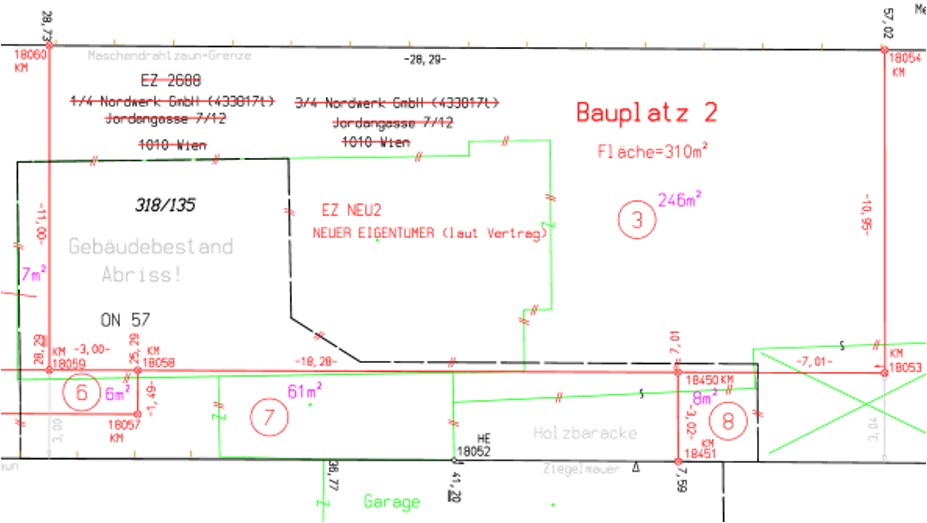 | Beschreibung: | Baugrund mit zwei Doppelhaushälften (KG, EG, OG, DG) in Rohbauzustand Fahnengrundstück, Nettobaufläche 310 m² Bei der Liegenschaft handelt es sich um eine Fahnenparzelle. Die Liegenschaft ist an den Seiten mit Maschendrahtzaun eingefriedet. Eine Abgrenzung zu den anderen beiden Bauplätzen fehlt. Der Bauplatz hat einen annähernd rechteckigen Zuschnitt mit einer Breite von ca. 11 m, eine Länge von ca. 28 m und ist eben. Die Liegenschaft ist nur über eine Fahne erreichbar. Das Grundstück ist verwildert, darauf sind Baumaterialien abgelagert. Das darauf errichtete Objekt befindet sich im Rohbauzustand. Am 15.03.2022 wurde auf der Liegenschaft mit dem Bau von zwei Doppelhaushälften begonnen, diese sind bis heute nicht fertiggestellt. Die Baubewilligung wurde allerdings erst am 09.10.2023 erteilt. Der Rohbau besteht aus Keller, Erdgeschoss, Obergeschoss und Dachgeschoss. Hinsichtlich Fertigstellungsgrad, Bauzustand, Fertigstellungskosten und Rückbaukosten wird auf das Gutachten des Sachverständigen DI Martin. Buschina verwiesen. Es bestehen keine bewertungsrelevanten Lasten. Die Liegenschaft ist nicht vermietet. Informationen über eventuell bestehende Abgabenrückstände liegen nicht vor. |