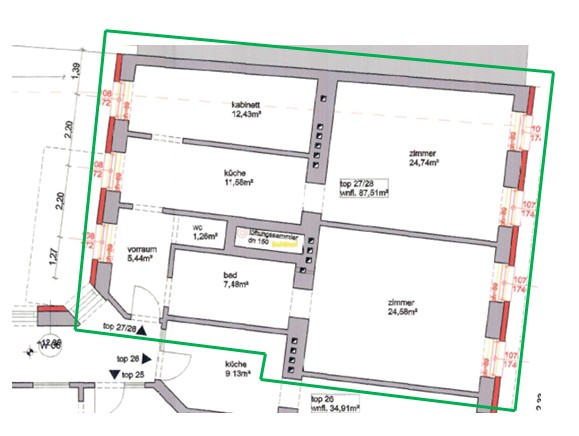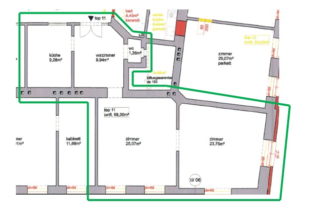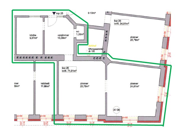 | Beschreibung: | Die Wohnung W 25 liegt im 3. Obergeschoss und hat lt. NWGA eine Nutzfläche von 71,91 m². Die Beheizung erfolgt mittels Gasetagenheizung; die Wärmeverteilung über Radiatoren. Die Ausstattung mit Fliesen-, Melan- und einem teils stärker abgenutzten Parkettboden sowie Kunststofffenstern mit Isolierglas ist einfach und zweckmäßig; der Zustand ist als mittel zu qualifizieren. |