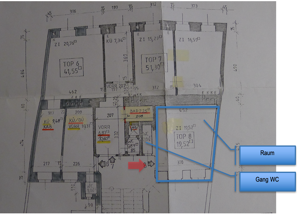 | Beschreibung: | Getrennte Versteigerungen von zwei Objekten in Mehrparteienhaus aus Bj 1895 in 1070 Wien, Halbgasse 27; Straßentrakt mit Keller und 5 Geschoßen, Dachgeschoßausbau 1994 – 1997; Nebentrakt im Hof; durchschnittlicher Erhaltungszustand des Hauses, Lift zentrale Lage mit guter Anbindung an den öffentlichen Verkehr; Reparaturrücklage per 11/2025 ca. EUR 77.000,-- (Information der Hausverwaltung Ludwig Hallas GmbH) -- 11/1940 Anteile, BLNr. 37, Wohnungseigentum an Lager 8 Lager ist im Hochparterre hofseitig ausgerichtet; bestehend aus einem Raum mit Parkettboden, zwei Fenstern, Waschbecken und Durchlauferhitzer; Gang-WC (keine Kenntnis, ob eine ausschließliche Nutzung vorliegt); keine Sanitäranlagen oder Heizung; Wasserschaden an einer Wand; Nutzfläche lt Wohnungseigentumsvertrag 1995: 19,52 m²; Widmung als Lager! durchschnittlicher bis sanierungsbedürftiger Erhaltungszustand Lager wird von Verpfl. eigengenutzt Es wird explizit auf das ausführliche Gutachten hingewiesen! |