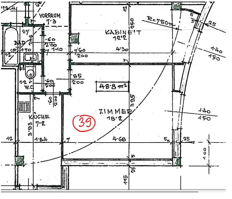 | Beschreibung: | Vermietete Eigentumswohnung in einem augenscheinlich guten Erhaltungs- und Ausstattungszustand bestehend aus einem Zimmer, einem Kabinett, einer Küche, einem Badezimmer, einem WC und kleinem Vorraum. Nutzflächenangaben weichen zwischen einzelnen Quellen (Nutzwertgutachten, Bauplan) etwas ab. Gebäude steht unter Denkmalschutz. Die Wohnung ist derzeit vermietet. Der Mietvertrag wurde am 3.5.2021 befristet bis 31.5.2026 abgeschlossen. Die Nettomiete betrug im Zeitpunkt des Mietvertragsabschlusses EUR 596,34. Nach Angaben der bei der Befundaufnahme angetroffenen Mieterin beträgt der Hauptmietzins aktuell EUR 677,33. |