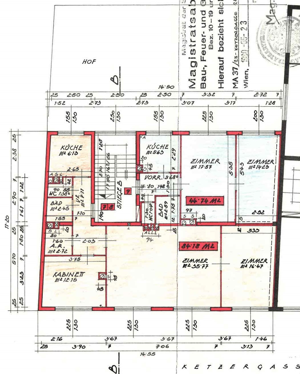 | Beschreibung: | Lage im 2. Stock, erreichbar über Stiegenhaus ohne Lift. Vorraum, 2 Zimmer (dv. 1 Durchgangszimmer), Kabinett, AR, Bad, WC, Küche. Überwiegende Ausrichtung zur Ketzergasse (etwa Südosten). Küche gegen Hof ausgerichtet. Bad und WC sind innenliegend, klein dimensioniert und unbelichtet. Gas-Etagenheizung, Radiatoren. Durchschnittlicher Erhaltungszustand. Fassade stirnseitig gegen Ketzergasse 288 nicht gedämmt. |
