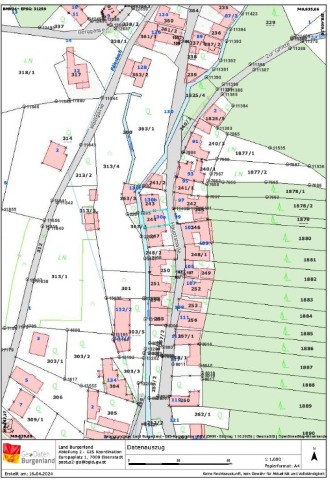 | Beschreibung: | Lage: Die beiden Grundstücke mit dem darauf befindlichen Wohngebäude liegen im westlichen Ortsgebiet von Wiesen in ca. 1 km Entfernung zum Ortszentrum. Die Lage der Grundstücke ist als eben zu bezeichnen. Die Figuration des Grundstückes 244 ist rechteckig, die Figuration des Grundstückes 363/4 ist dreiecksförmig. Anzumerken ist, dass die beiden Grundstücke durch einen unterirdisch verrohrten Bach/Graben voneinander getrennt sind, jedoch in natura eine einheitliche Nutzung besteht. Die Aufschließung und Erreichung er-folgt von der ostseitig an der Liegenschaft vorbeiführenden Hauptstraße. Aufgrund der Lage, der Größe und der Figuration erfolgt eine entsprechende Bewertung. Infrastruktur: Öffentliche Bushaltestellen, Gaststätten, Einkaufsmöglichkeiten, Kinderbetreuungseinrichtung und Volksschule sind in Wiesen vorhanden. Die nächstgelegenen größeren infra-strukturellen Gegebenheiten befinden sich in Mattersburg bzw. Wiener Neustadt. Gebäudebeschreibung - Wohngebäude: Das gegenständliche Wohngebäude wurde, wie dem beiliegenden Baubewilligungsbescheid zu entnehmen ist, ab dem Jahr 1994 hergestellt. Die Benützungsbewilligung erfolgte 1996. Das Gebäude ist in Massivbauweise, überwiegend dreigeschoßig, bestehend aus Keller, Erd- und Obergeschoß hergestellt. Im Kellergeschoß befinden sich Nebenräumlichkeiten wie Kellervorraum, Technikraum und 2 Kellerräume. Im Erdgeschoß sind vorhanden Vorraum und Eingangsbereich, WC, Küche, Wohn- und Esszimmer, Loggia und Garage. Im Obergeschoß befinden sich Gang, Bad, Abstellraum, WC, Arbeitszimmer, Vorraum, Schlafzimmer, Schrankraum und Kinderzimmer. Die Aufschließung und Erreichung vom Grundstück und Gebäude erfolgt, wie bereits vor festgehalten, von der ostseitig an der Liegenschaft vorbeiführenden Hauptstraße, von wo aus die Zufahrt zur Garage und der Eingang über 2 Vorlegstufen zu den Wohnräumen im Erdgeschoß möglich ist. Die Geschoßverbindung vom Keller zum Erdgeschoß sowie vom Erd- zum Obergeschoß erfolgt über Massivstiegen. Vom Wohnzimmer zur Loggia im Garten besteht ebenfalls ei-ne einläufige Massivstiege. Zum Spitzboden hin besteht eine ausziehbare Treppe. Außenanlagen: Der Zugang und die Zufahrt zum Haus sind asphaltiert. Im Haupteingangsbereich vorhanden 2 geflieste Vorlegstufen. Im Anschluss an das Haus besteht eine gepflasterte Fläche. In diesem Bereich führt unterirdisch der verrohrte Bach/Graben. Das Grundstück im Anschluss ist begrünt und besteht eine Einfriedung mittels Maschenzaun mit teilweise Sichtschutzelementen. |
