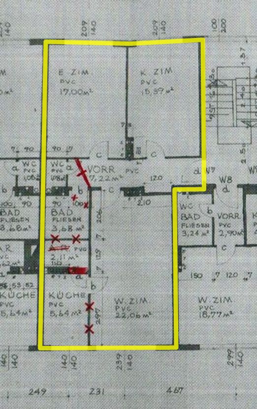 | Beschreibung: | Das Wohngebäude wurde im Jahr 1964 fertiggestellt und besteht aus zwei Stiegenhäuser mit einem zusammenhängenden Kellergeschoss und jeweils einem Erdgeschoss und zwei Obergeschossen. An der Purkersdorfer Straße befindet sich ein Nebengebäude mit einem Geschäftslokal. Hofseitig befindet sich ein ebenerdiges Garagengebäude mit 4 Garagenboxen. Im Kellergeschoss sind die Kellerabteile der Wohnungen, eine Waschküche, ein Fahrrad- und Kinderwagenraum und Technikräume untergebracht. In den Erdgeschossen und den Obergeschossen sind Wohnungen angeordnet. Die zu bewertende Wohnung Top W 15 (= Top 7 Stiege 2) befindet sich im 2.Obergeschoss der Stiege 2. Die Eingangsbereiche sind mit Gegensprechanlagen mit Türöffner zu den einzelnen Wohnungen verbunden. Das Gebäude ist mit keinem Personenaufzug ausgestattet. Das Wohnhaus ist in Massivbauweise errichtet und hat eine einfach gegliederte Fassade. Das Dach ist als Flachdach ausgebildet. Der Innenhof ist teilweise befestigt und teilweise begrünt. Das Wohnhaus ist parifiziert, an den Wohnungen und dem Geschäftslokal ist Wohnungseigentum begründet und im Grundbuch der EZ 387 einverleibt. Die Kellerabteile sind den Wohnungen nicht als Zubehör gemäß WEG zugeordnet. Die Wohnhausanlage ist in einem dem Alter entsprechend mittleren Zustand vorhanden. Die Wohnung Top W 15 (= Top 7 Stiege 2) liegt im 2.Obergeschoss und besteht aus einem Vorraum, einem Bad mit WC, einem Wohnzimmer mit Küche und zwei Zimmer. Die Wohnung ist mit der Küche und dem Wohnzimmer westseitig (zur Salzerstraße) und den zwei Zimmer ostseitig (zum Innenhof) ausgerichtet. Die Wohnung wird durch Kunststofffenster belichtet. Die Wohnung wird durch eine Gastherme im Bad beheizt und mit Warmwasser versorgt. Im Vorraum befindet sich der Wohnungsapparat der Gegensprechanlage und der Elektrosicherungskasten. Im Kellergeschoss wird ein Kellerabteil genutzt, das Kellerabteil ist der Wohnung nicht als Zubehör gemäß WEG zugeordnet. Die Wohnung ist in einem durchschnittlichen Zustand vorhanden, Heizungsleitungen sind auf Putz verlegt, teilweise fehlen Sockelleisten bei den Bodenbelägen. Bauwerksstatische und vermessungstechnische Überprüfungen sowie bautechnische und haustechnische Bauwerksüberprüfungen haben durch den Sachverständigen im Zuge der Befundaufnahme auftragsgemäß nicht stattgefunden (kein bautechnisches Gutachten), die Beschreibung der vorhandenen Bauausführungen erfolgte ausschließlich durch augenscheinliche Befundung des Gebäudebestandes (ohne Bauwerksöffnungen). |