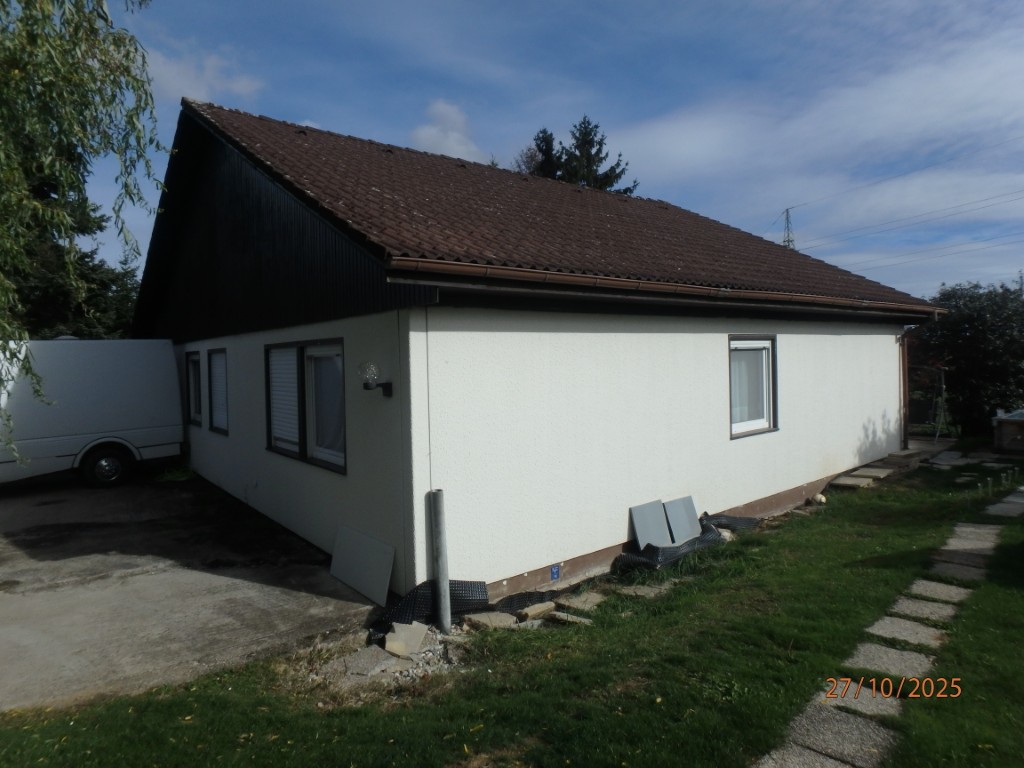 | Beschreibung: | LAGE: Dieses Grundstück mit dem darauf befindlichen Wohnhaus liegt am Stadtrand von Fürstenfeld auf einer Anhöhe gelegen, in einer Ruhezone befindlich, mit gutem Ausblick. Die Erreichbarkeit erfolgt über eine asphaltierte Stadtstraße mit der Bezeichnung „Stadtbergenweg“, welcher westseitig an der Liegenschaft vorbeiführt. Die umliegenden Grundstücke, westseitig von der Straße, sind mit diversen Wohn- und Nebengebäuden bebaut. Der ost-seitige Bereich sowie tw. der nordseitige Bereich, mit Ausnahme eines Vierkanthofes nordseitig anschließend, sind zur Gänze unbebaut. INFRASTRUKTUR: Sämtliche infrastrukturellen Gegebenheiten, wie öffentliche Haltestellen (Bahn und Bus), Gaststätten, Einkaufsmöglichkeiten für den täglichen Gebrauch, Kinderbetreuungseinrichtung, Schulen, Banken, etc. sind in Fürstenfeld vorhanden. GEBÄUDEBESCHREIBUNG: WOHNGEBÄUDE: Wie dem Bauakt zu entnehmen liegt eine Baubewilligung von 1977 sowie ein Einreichplan betreffend Einfamilienhaus von 1980 vor, eine Bewilligung für die Errichtung einer Ölzentralheizung von 1980. Die Benützungsbewilligung für das Gebäude wurde 1982 erteilt. Das Gebäude hat rechteckige Grundrissform und ist zweigeschossig (Keller und Erdgeschoss) ausgeführt. Der Keller ist massiv errichtet. Diesem Kellergeschoss ist ein Fertig-haus (Zenker-Haus) aufgesetzt. An Räumlichkeiten bestehen im ERDGESCHOSS wie folgt: 3 Schlafzimmer, Essraum, Küche, Zwischenflur, Vorraum-Windfang, WC, Badezimmer und Zimmer. Im KELLER vorhanden sind an Räumen: Heizraum, Tankraum, 2 Lagerräume, Vorraum, Vorkeller und Werkstätte. Die Aufschließung und Erreichung erfolgt von der asphaltierten Straße „Stadtbergenweg“, sodass Zugang und Zufahrt von dieser Straße aus bestehen. Der Eingang in das Haus er-folgt über eine Vorlegstufe. Keller- und Erdgeschoss sind über eine Stiege, welche sich im Haus befindet, verbunden. GARTENHÜTTE, POOL (2 STK.) und ÜBERDACHTE TERRASSE: Diese Gartenhütte sowie die Pools und die überdachte Terrasse besitzen keinen Verkehrswert. Von einer detaillierten Beschreibung wird daher Abstand genommen und wird auf die Fotodokumentation verwiesen. AUSSENANLAGEN und EINFRIEDUNGEN: Der Eingang in das Haus erfolgt über eine Vorlegstufe aus Betonträger mit Waschbeton-trittplatten belegt und einem Metallgeländer sowie einem Vordach. Diese Stiege befindet sich in Schräglage (Konstruktion, Stiege und Pfeiler). Die Zufahrt und der Zugang sind geschottert und besteht eine Maschenzauneinfriedung an der linken Seite mit einer Fichtenbaumreihe. Im Vorgarten sind diverse Sträucher vorhanden. An der rechten Seite besteht eine weitere Zufahrt bzw. Zugang zur an der Rückseite befindlichen Terrasse. Die Einfriedung in diesem Bereich besteht aus einer Thujenhecke, ca. 5 m hoch. Der Vorplatz beim Haus ist mit Betonflöz versehen (unterschiedliches Niveau) und besteht aufgrund der Geländesituation eine Betonsteinmauer. An der rechten Seite vom Haus angeschlossen ist eine kleine Terrasse mit Betonsteinplatten belegt, mit unübersehbaren Setzungsschäden. Der rückwärtige Bereich des Grundstückes ist mit Maschenzaun eingefriedet. Die nicht bebauten und befestigen Flächen stellen Grünzone – Gartenflächen dar, gleichfalls in keinem optimal gepflegten Zustand. |